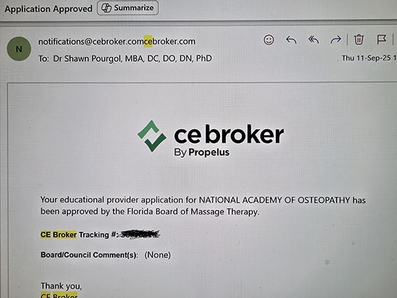 As of September 11, 2025, the National Academy of Osteopathy has been approved as a provider by the Florida Board of Massage Therapy. This approval allows us to legally offer continuing education programs to massage therapists in Florida, with credits that count toward their mandatory CE requirements. It also officially authorizes us to operate as a continuing education provider in the state. It’s worth noting that offering CE programs in Florida without registration through one of the health regulatory boards is considered a felony and a criminal offense.